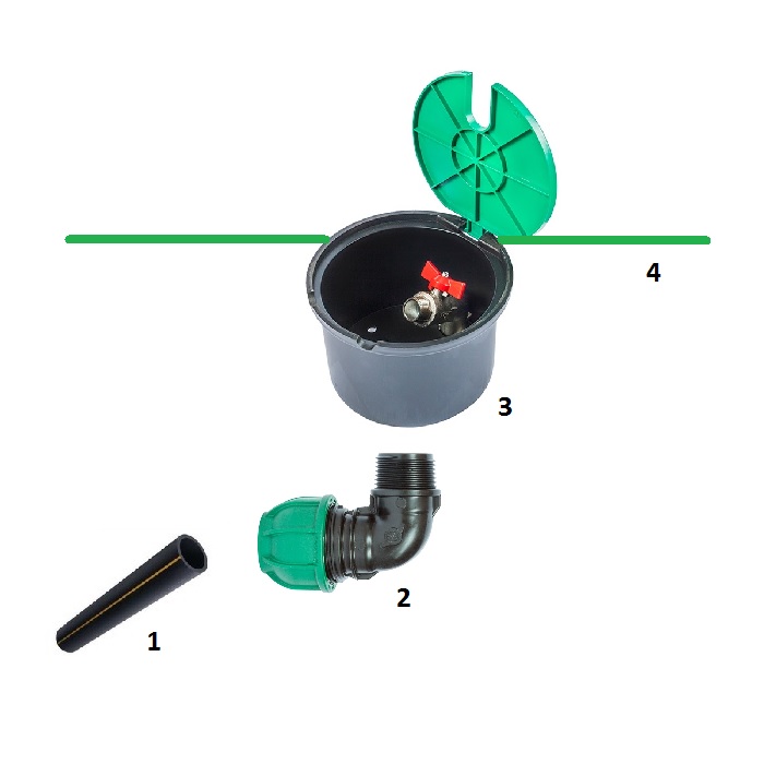 A földbe süllyeszthető lépésálló műanyag csapszekrény a kertben, fűben észrevétlen fedele zöld színű. A fedélen a kerti tömlőnek, slagnak kialakított rész van, így azt használat közben is zárva tarthatjuk. A csapszekrény gyárilag egy 3/4″ colos fém golyós csap van szerelve, mely 45 fokban áll felfelé a csapszekrény zöld fedelének kivágott része felé.